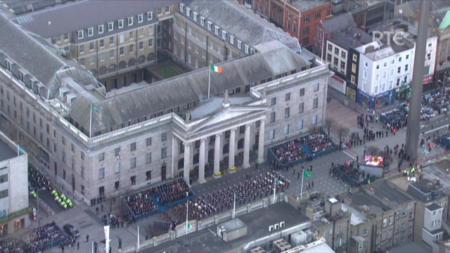 RTÉ’s production team worked with the Air Corps, the Department of Defence and TVM Outside Broadcast to deliver live aerial coverage of the ceremonies and parade. RTÉ made a separate recording of the helicopter camera from beginning to end, whenever it was in flight over Dublin. RTÉ is now making available a 40 minute edit of the footage, showing the parade and well-known Dublin landmarks including St Stephen’s Green, Dublin Castle, the Four Courts and the GPO.